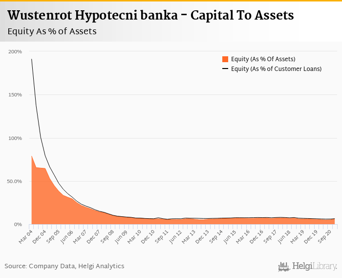 Wustenrot Hypotecni banka's Equity reached 6.22% of total assets in the 4Q2020, up from 5.52% for the previous year. As a share of net customer loans, the ratio amounted to 6.37% at the end of the fourth quarter of 2020.