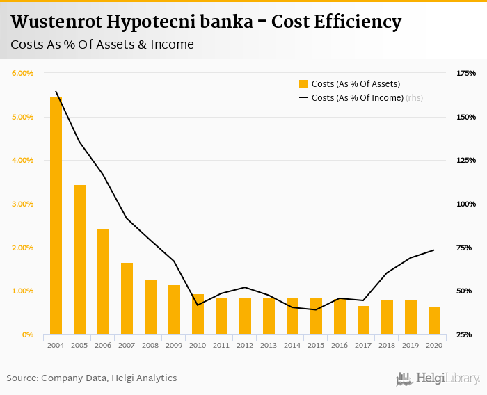Comparing Wustenrot Hypotecni banka with its closest peers, Hypotecni Banka operated in 2020 with a cost to income ratio of 29.8% in 2020, Ceska Sporitelna reached 47.6% and Komercni Banka some 50.5%.