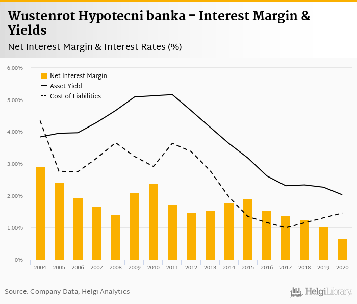 Comparing Wustenrot Hypotecni banka with its closest peers, Hypotecni Banka operated in 2020 with a net interest margin of 0.872% in 2020, and Komercni Banka reached 1.90%.