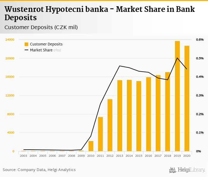 Wustenrot Hypotecni banka accounted for 0.441% of all customer deposits taken by banks in Czechia at the end of 2020. Historically, the bank’s market share in customer deposits reached an all time high of 0.501% in 2019 and an all time low of 0.005% in 2008.