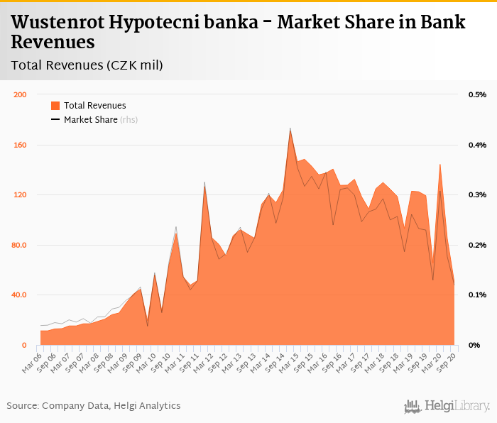 As a result, Wustenrot Hypotecni banka accounted for 0.119% of all bank revenues generated by banks in Czechia in 2020-09-30. Historically, the bank’s market share in total revenues reached an all time high of 0.433% in 2014-12-31 and an all time low of 0.037% in 2009-12-31.