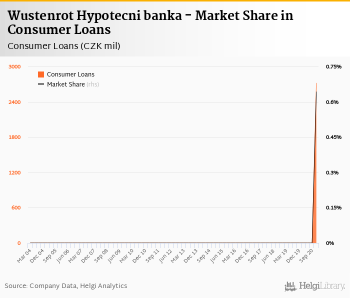Wustenrot Hypotecni banka's consumer loans reached CZK 2,721 mil in 2020-12-31, down 0% compared to the previous year.