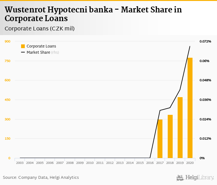 Wustenrot Hypotecni banka accounted for 0.069% of all corporate loans issued in Czechia at the end of 2020. Historically, the bank’s market share in corporate loans reached an all time high of 0.069% in 2020 and an all time low of 0% in 2003.