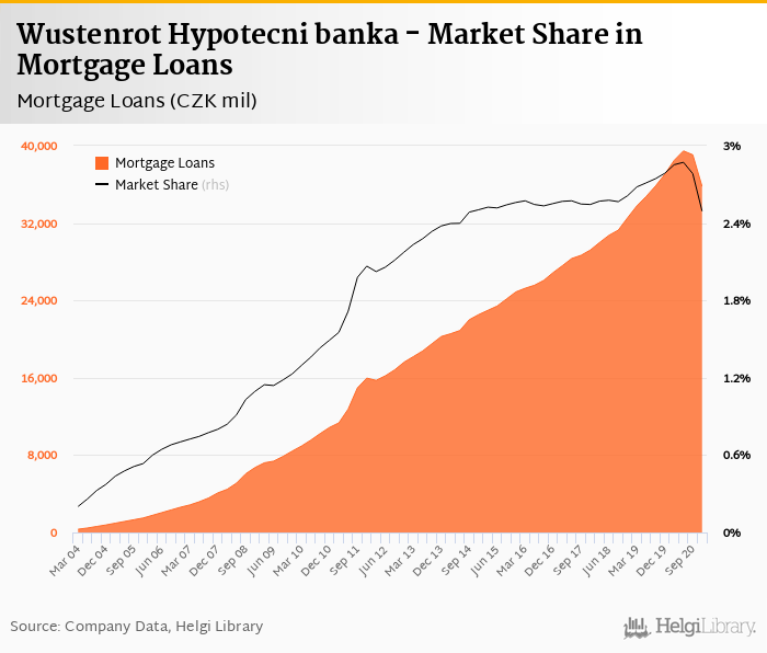 Wustenrot Hypotecni banka's mortgage loans reached CZK 35,789 mil in 4Q2020, down 8.38% compared to the previous year.