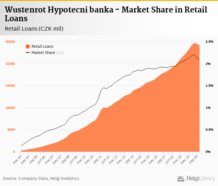 Wustenrot Hypotecni banka's retail loans reached CZK 38,510 mil in the fourth quarter of 2020, down 1.41% compared to the previous year.