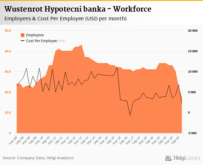 Wustenrot Hypotecni banka employed 17.0 persons in 2020-12-31, down 22.7% when compared to the previous year. Historically, the bank's workforce hit an all time high of 43.0 persons in 2013-03-31 and an all time low of 17.0 in 2020-12-31.