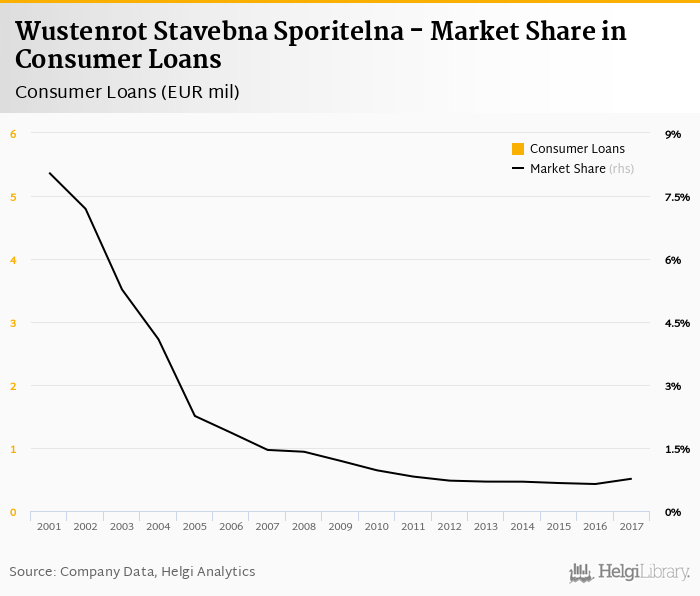 Wustenrot Stavebna Sporitelna accounted for 0.769% of all consumer loans issued in Slovakia at the end of 2017. Historically, the bank’s market share in consumer loans reached an all time high of 8.06% in 2001 and an all time low of 0.642% in 2016.