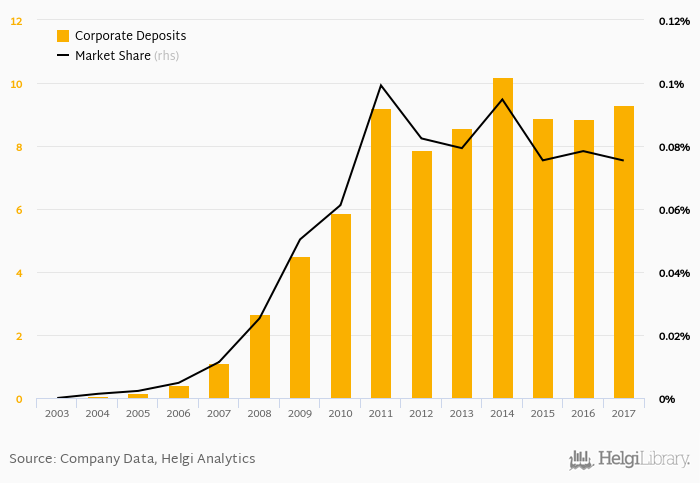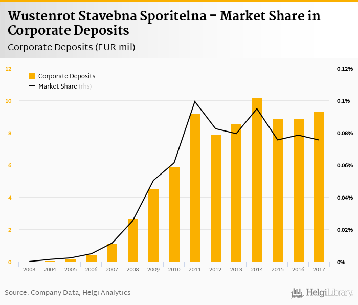 Wustenrot Stavebna Sporitelna accounted for 0.075% of all corporate deposits taken by banks in Slovakia at the end of 2017. Historically, the bank’s market share in corporate deposits reached an all time high of 0.099% in 2011 and an all time low of 0% in 2003.