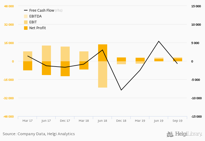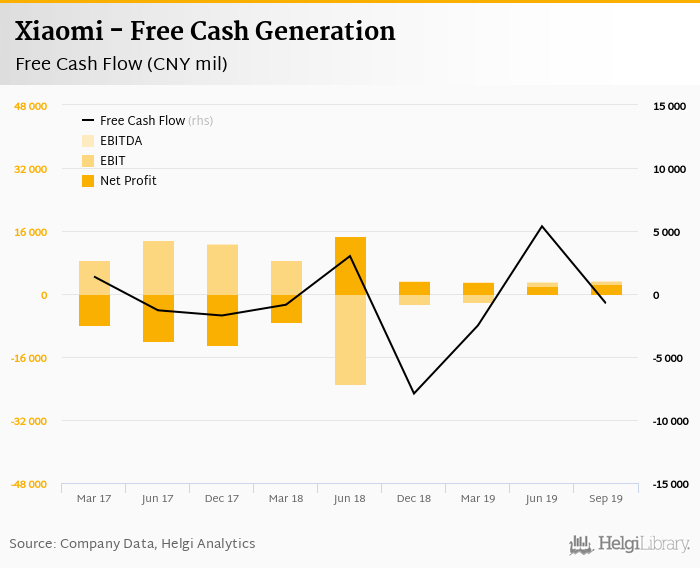 The company generated cash, defined by a sum of net profit and depreciation, of CNY 2,764 mil or 5.15% of sales. When investments are excluded, free cash flow reached CNY -746 mil, or -1.39% of sales in 3Q2019.