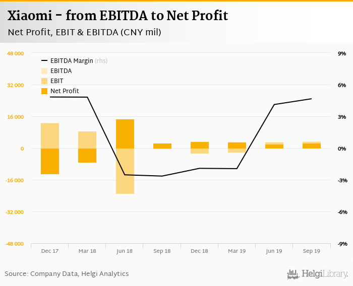 Xiaomi made a net profit of CNY 2,525 mil with revenues of CNY 53,661 mil in 3Q2019, up by 29.4% and up by 3.29%, respectively, compared to the previous year. This translates into a net margin of 5.68%.