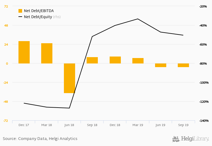 Net debt to EBITDA was calculated at -4.49x at the end of the quarter. That is down from x seen in 2014-09-30. The ratio reached a high of 28.0x in 4Q2017 and a low of -37.2x in 2Q2018.