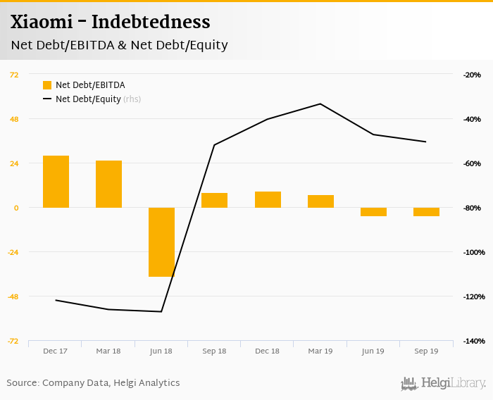 Xiaomi's net debt stood at CNY -40,547 mil and accounted for -50.6% of equity at the end of 3Q2019. The ratio is up 1.40 pp compared to the previous year.