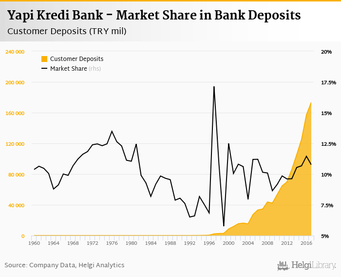 Yapi Kredi Bank accounted for 10.8% of all customer deposits taken by banks in Turkey at the end of 2017. Historically, the bank’s market share in customer deposits reached an all time high of 17.1% in 1997 and an all time low of 5.76% in 1999.