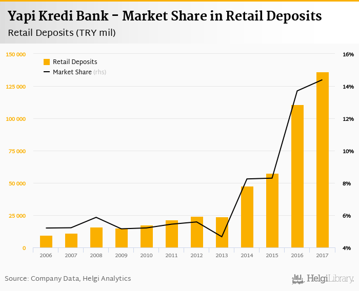 Yapi Kredi Bank accounted for 14.4% of all retail deposits taken by banks in Turkey at the end of 2017. Historically, the bank’s market share in retail deposits reached an all time high of 14.4% in 2017 and an all time low of 4.66% in 2013.