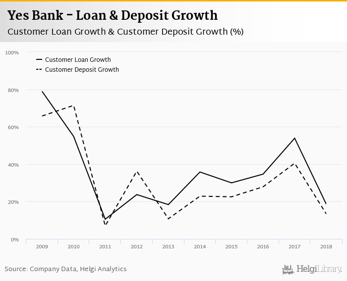 Yes Bank's customer loan growth reached 18.6% in 2018, down from 53.9% compared to the previous year. Historically, the bank’s loans growth reached an all time high of 78.9% in 2009 and an all time low of 10.5% in 2011. In the last decade, the average annual loan growth amounted to 0%.
