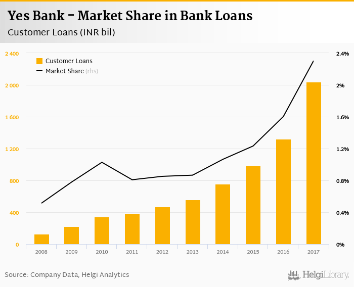 Yes Bank's customer loans reached INR 2,035 bil in 2017, up 53.9% compared to the previous year.