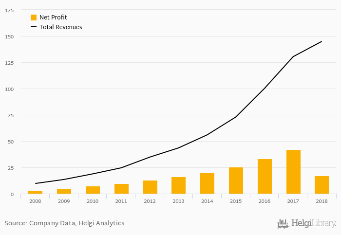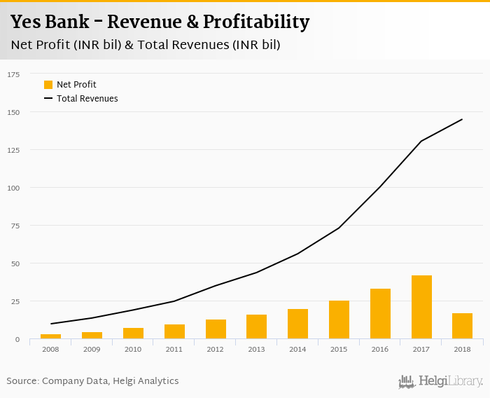 Yes Bank made a net profit of INR 17.1 bil under revenues of INR 145 bil in 2018, up -59.6% and 11.2% respectively compared to the previous year.