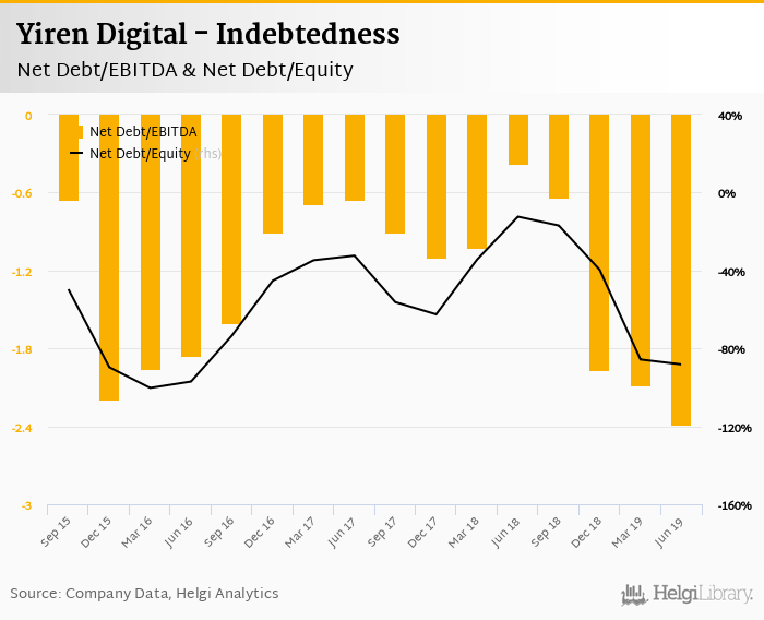 Yiren Digital's net debt stood at CNY -2,365 mil and accounted for -88.2% of equity at the end of 2Q2019. The ratio is down 75.8 pp compared to the previous year.