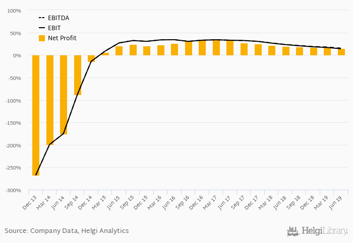 This translates into a net margin of 15.3%. Historically, between 2013-03-31 and 2Q2019, the firm’s net margin reached a high of 36.1% in 1Q2017 and a low of -5,801% in 1Q2013. The average net margin in the last five years amounted to 15.6%.