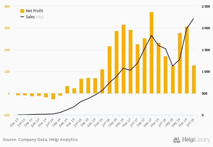 Sales have grown by 161% a year on average since 2Q2014. They reached a high of CNY 2,217 mil in 2Q2019 and a low of CNY 0.187 mil in 1Q2013.