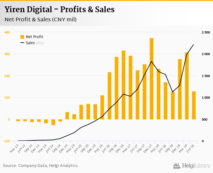 Yiren Digital made a net profit of CNY 154 mil in 2Q2019, down 24.5% compared to the previous year. Total sales reached CNY 2,217 mil, which is up 45.9% when compared to the previous year.