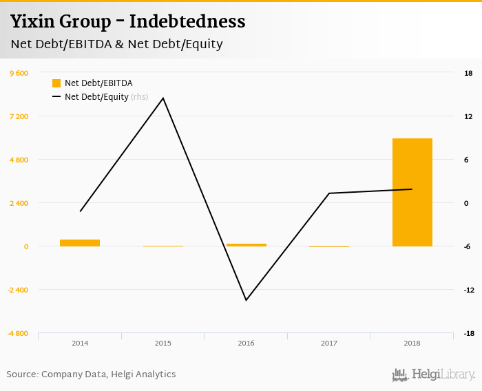 Yixin Group's net debt stood at CNY 28,082 mil and accounted for 1.82 of equity at the end of 2018. The ratio is up 0.565 pp compared to the previous year.