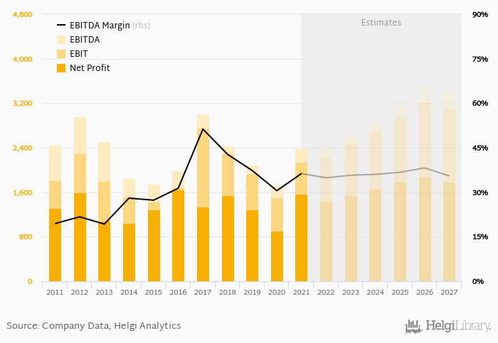On the operating level, EBITDA reached USD 2,389 mil, up 38.4% compared to the previous year. Over the last five years, company's EBITDA has risen 3.70% a year on average.
