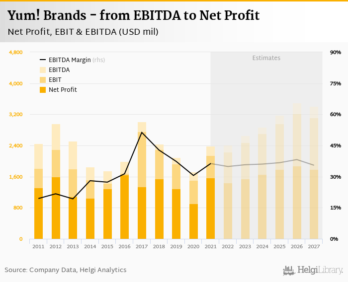 Yum! Brands made a net profit of USD 1,575 mil with revenues of USD 6,584 mil in 2021, up by 74.2% and up by 16.5%, respectively, compared to the previous year. This translates into a net margin of 23.9%.