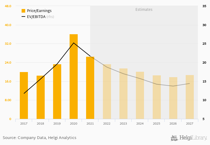 At the end of 2021, the firm traded at price to earnings of 26.5x. Over the last five years, this multiple achieved a high of 36.1x in 2020 and a low of 18.5x in 2018 with an average of 24.9x.