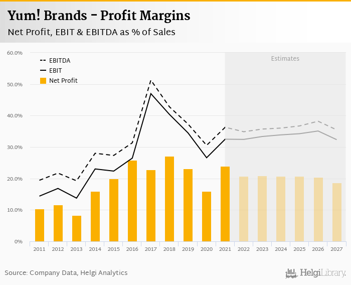 Yum! Brands made a net profit of USD 1,575 mil with revenues of USD 6,584 mil in 2021, up by 74.2% and up by 16.5%, respectively, compared to the previous year.