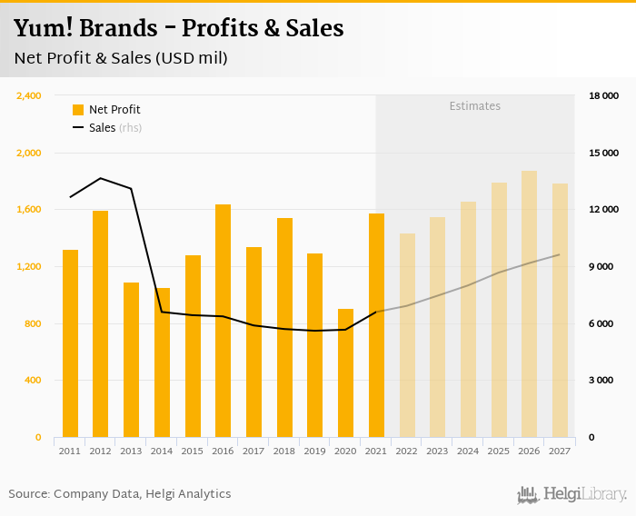 Yum! Brands made a net profit of USD 1,575 mil in 2021, up 74.2% compared to the previous year. Total sales reached USD 6,584 mil, which is up 16.5% when compared to the previous year.