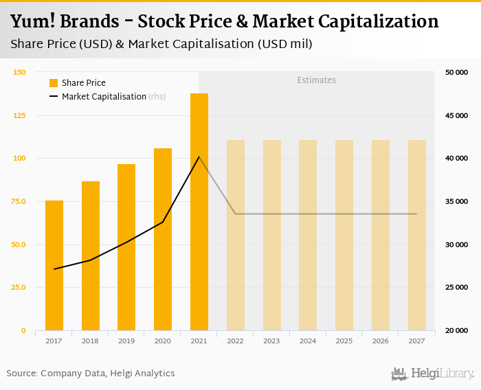 Yum! Brands stock traded at USD 138 per share at the end 2021 implying a market capitalization of USD 40,131 mil.
