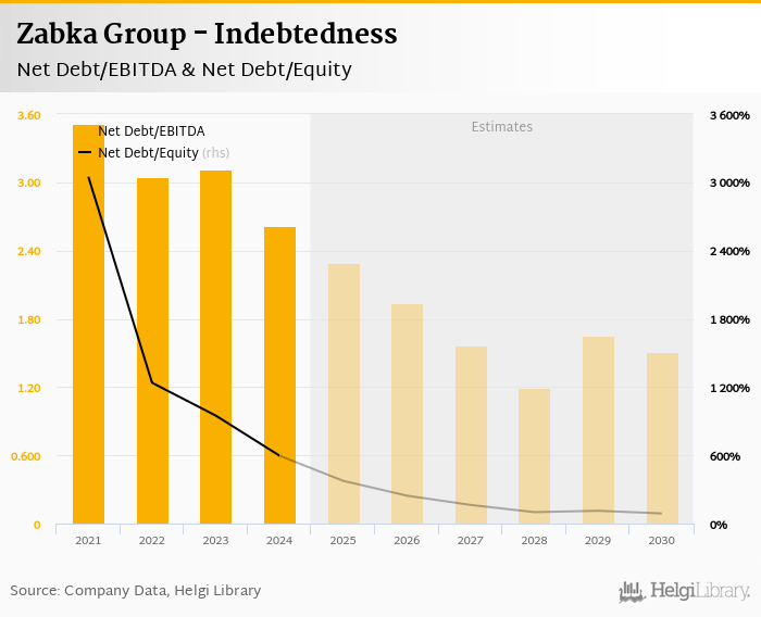 Zabka Group's net debt stood at PLN 8,999 mil and accounted for 597% of equity at the end of 2024. The ratio is down 352 pp compared to the previous year.