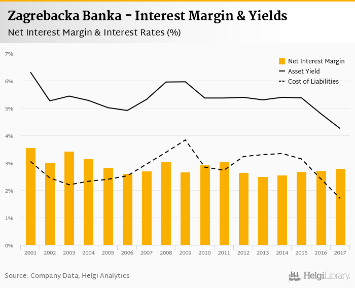 Zagrebacka Banka's net interest margin amounted to 2.80% in 2017, up from 2.71% compared to the previous year.