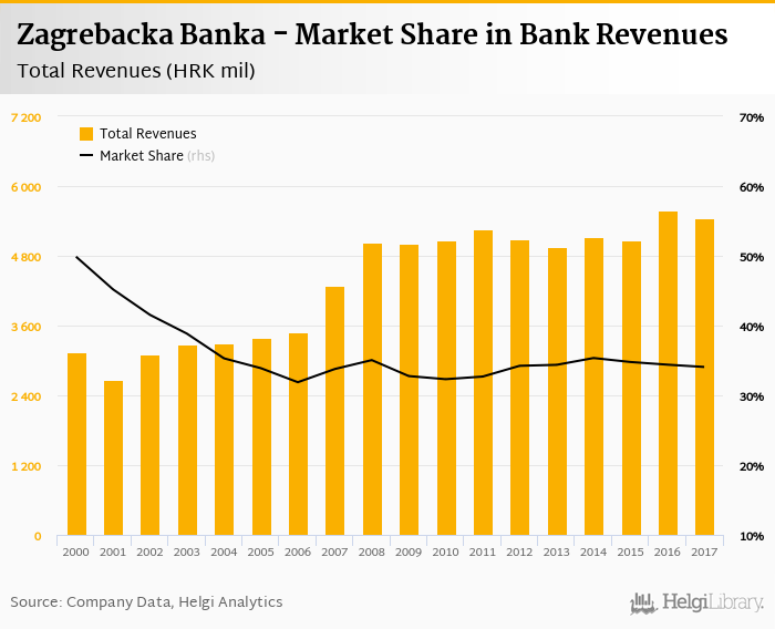 As a result, Zagrebacka Banka accounted for 34.1% of all bank revenues generated by banks in Croatia in 2017. Historically, the bank’s market share in total revenues reached an all time high of 49.9% in 2000 and an all time low of 31.9% in 2006.