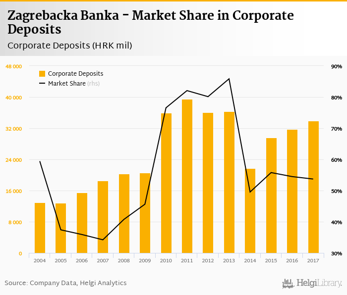 Zagrebacka Banka accounted for 53.7% of all corporate deposits taken by banks in Croatia at the end of 2017. Historically, the bank’s market share in corporate deposits reached an all time high of 85.8% in 2013 and an all time low of 34.2% in 2007.
