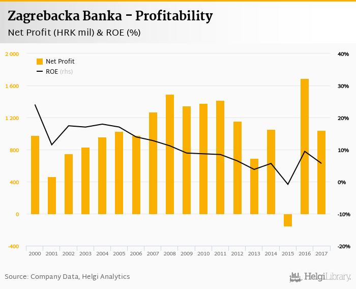 Zagrebacka Banka made a net profit of HRK 1,042 mil in 2017, down 38.2% compared to the previous year. This implies a return on equity of 5.66%.