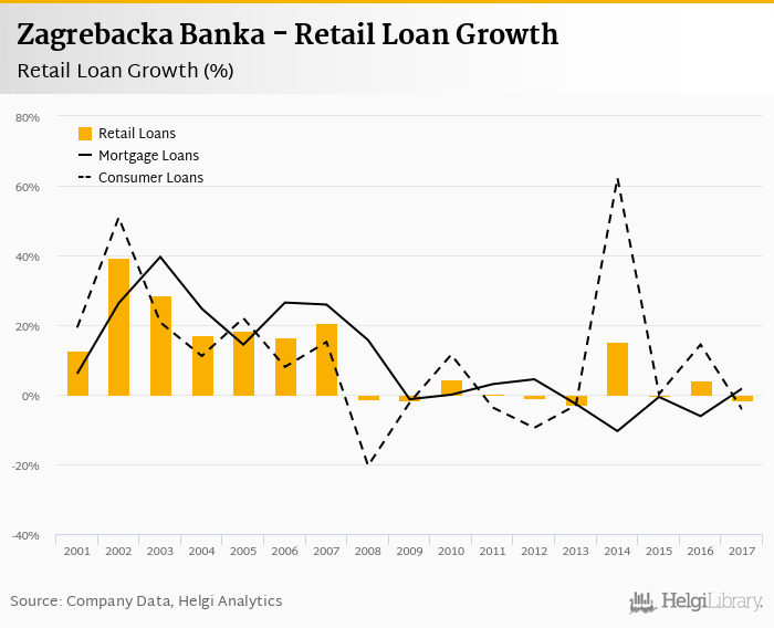 Zagrebacka Banka's retail loans reached HRK 35,446 mil at the end of 2017, down 1.52% compared to the previous year. In the last decade, the average annual loan growth amounted to 1.43%.