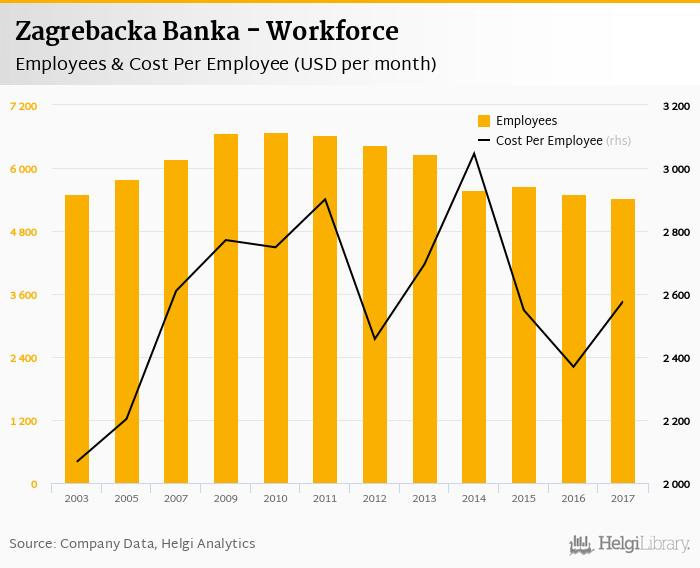 Zagrebacka Banka employed 5,424 persons in 2017, down 1.38% when compared to the previous year. Historically, the bank's workforce hit an all time high of 6,686 persons in 2010 and an all time low of 5,424 in 2017.