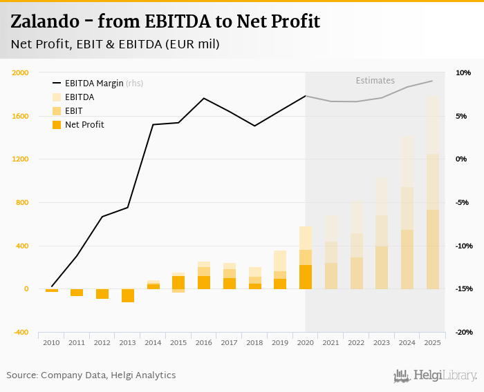 Zalando made a net profit of EUR 226 mil with revenues of EUR 7,982 mil in 2020, up by 127% and up by 23.1%, respectively, compared to the previous year. This translates into a net margin of 2.83%.