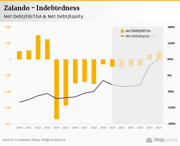 Zalando's net debt stood at EUR -760 mil and accounted for -35.3% of equity at the end of 2020. The ratio is down 16.0 pp compared to the previous year.