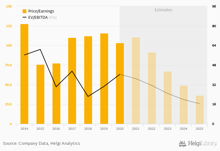 At the end of 2020, the firm traded at price to earnings of 103x. Over the last five years, this multiple achieved a high of 116x in 2019 and a low of 77.2x in 2016 with an average of 104x.