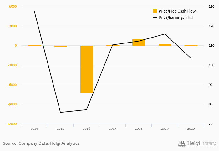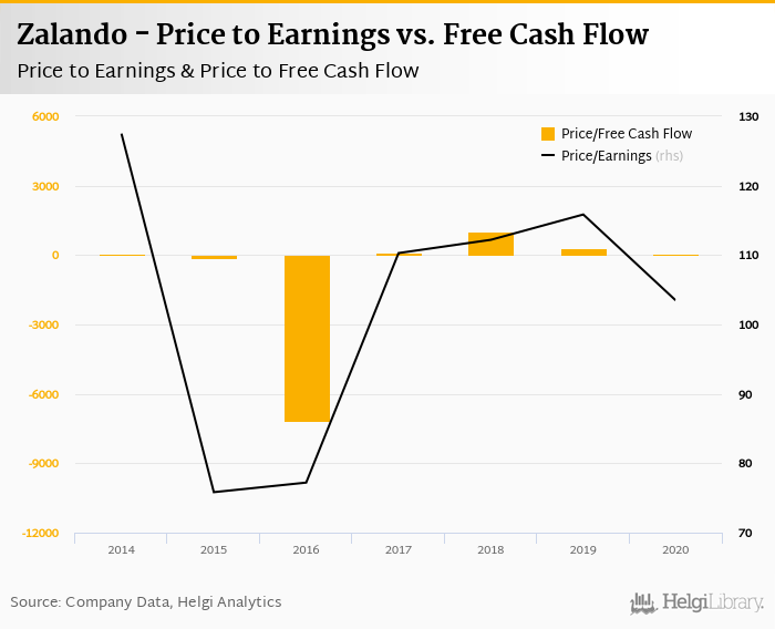 Regarding cash generated defined by the sum of net profit and depreciation, the stock traded at 64.1x at the end of 2020. When investments are excluded to get free cash flow, Zalando traded at 76.9x.