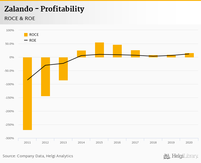 Zalando made a net profit of EUR 226 mil in 2020, up 127% compared to the previous year. Historically, between 2010 and 2020, the company's net profit reached a high of EUR 226 mil in 2020 and a low of EUR -117 mil in 2013.