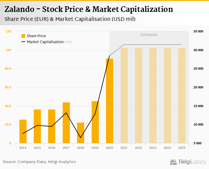 Zalando stock traded at EUR 91.1 per share at the end 2020 implying a market capitalization of USD 28,445 mil.