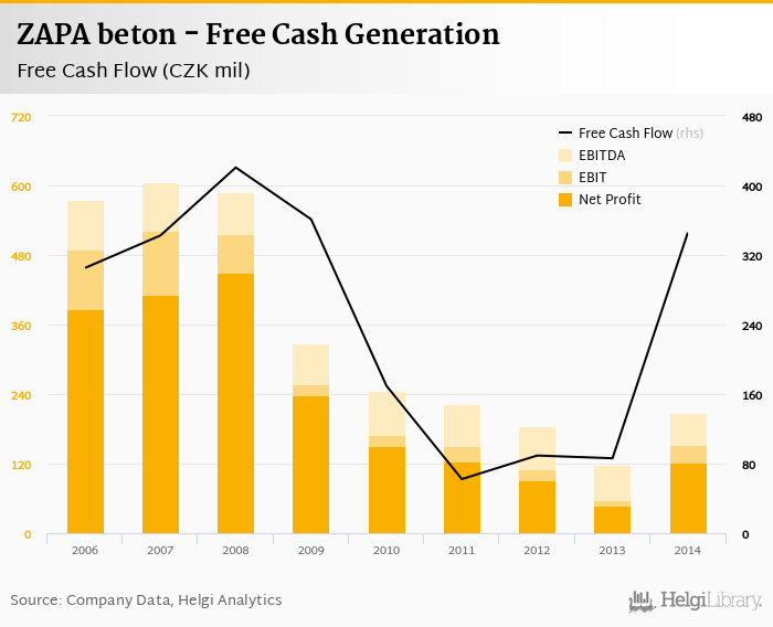 ZAPA beton made a net profit of CZK 123 mil with revenues of CZK 2,105 mil in 2014, up by 162% and up by 5.9%, respectively, compared to the previous year. This translates into a net margin of 5.82%.