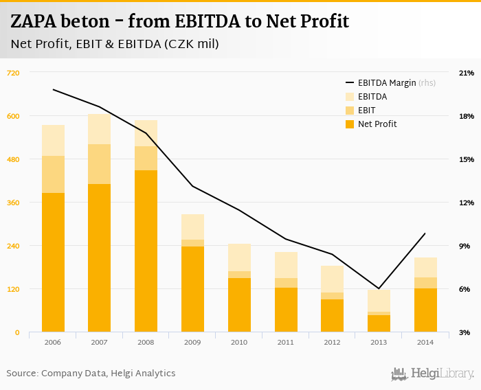 ZAPA beton made a net profit of CZK 123 mil with revenues of CZK 2,105 mil in 2014, up by 162% and up by 5.9%, respectively, compared to the previous year. This translates into a net margin of 5.82%.