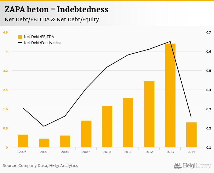 ZAPA beton's net debt stood at CZK 215 mil and accounted for 0.255 of equity at the end of 2014. The ratio is down 0.396 pp compared to the previous year.