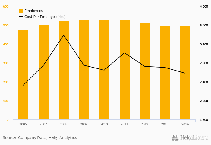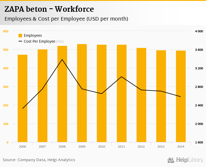 ZAPA beton employed 495 employees in 2014, down 0.402% compared to the previous year. Historically, between 2006 and 2014, the firm's workforce hit a high of 530 employees in 2009 and a low of 473 employees in 2006.