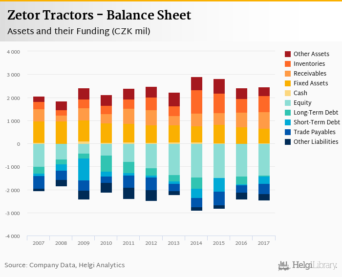 Zetor Tractors's total assets reached CZK 2,461 mil at the end of 2017, up 1.57% compared to the previous year.